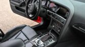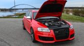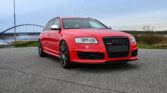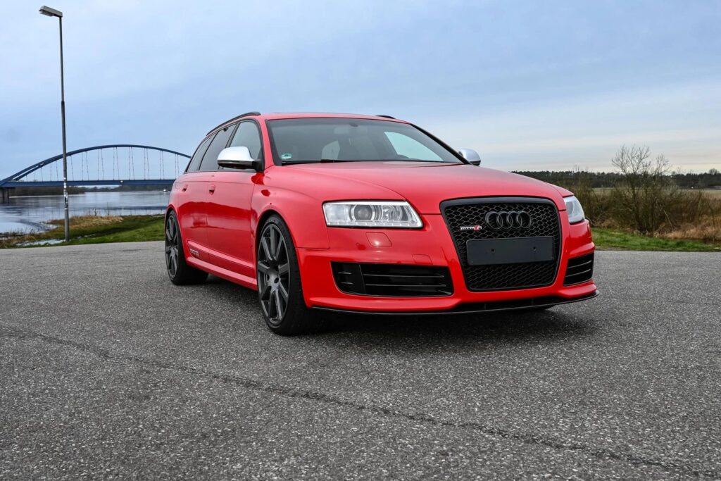 Zum Verkauf steht ein Audi C6 RS6 aus dem Jahr 2008 in der Farbe Misanorot und einer Innenausstattung aus schwarzem Leder.